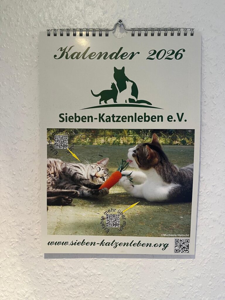 Vielen Dank an die Familien, die mit unseren Fotografen zusammengearbeitet haben und ihre Katzen als Models zur Verfügung gestellt haben. Wir danken dazu herzlichst Fotokatz Fotografie – Kristin Hofmann 📸🐈⬛, Cassandra Münick (https://www.pfotografie-muenick.com/) sowie Tanja Buchmühlen( https://www.tanidareal.com/) für die Genehmigung der Nutzung der Bilder für den Sieben-Katzenleben e.V. Kalender 2026 und der tollen Zusammenarbeit.
