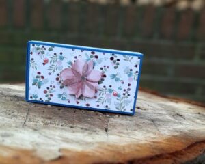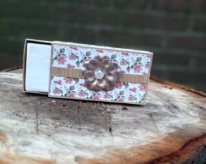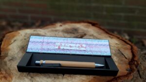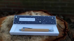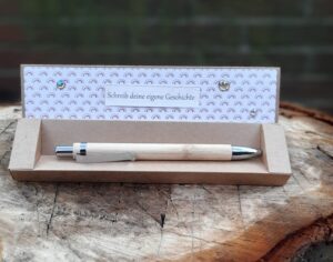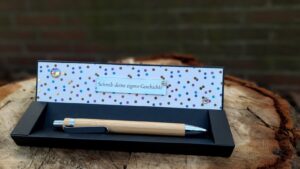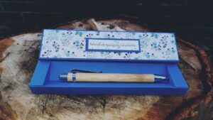 Holzkugelschreiber in wunderschöner selbstgemachter Verpackung.