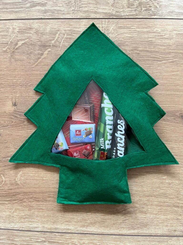 Der in Handarbeit gefertigte Tannenbaum aus Filz mit Sichtfenster aus Vinyl hat auf der Rückseite einen kleinen Schlitz zum Befüllen. Ideal, um z.B. Geld-Geschenke zu verpacken.