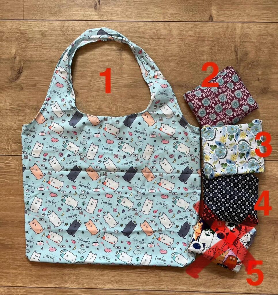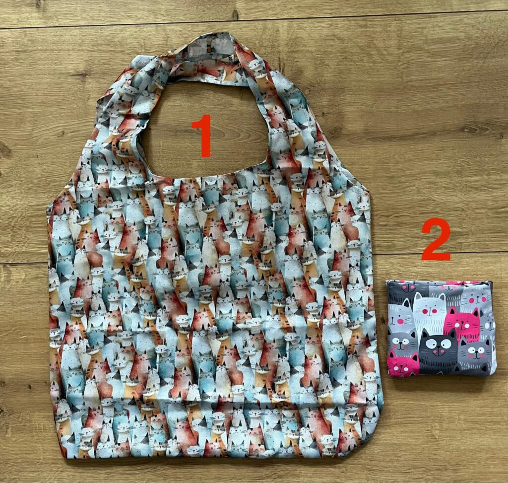 Die in Handarbeit gefertigte Einkaufstasche aus festem, wasserabweisendem Polyester gibt es mit 2 Motiven. Lässt sich einfach in der Jackentasche oder Handtasche verstauen und ist somit immer griffbereit.